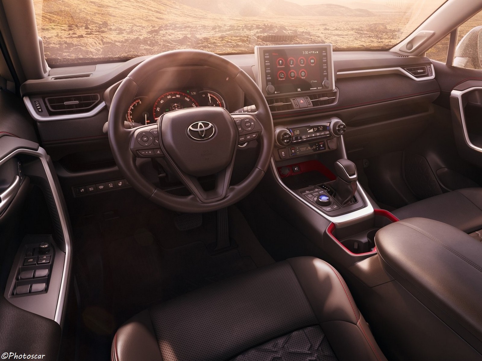 Les différences de style subtiles du RAV4 TRD Off-Road comprennent; Des carénages inférieurs avant et aussi arrière gris foncé. Egalement des feux de brouillard à LED ainsi que de nombreux accents peints en noir. Les plus grandes sur-ailes recouvrent donc des jantes en alliage TRD de 18 pouces, noires mates et fluides. Le tout enveloppées dans des pneus tout-terrain agressifs. À l’intérieur, les sièges avant noirs SofTex TRD ont une fonction de renforcement supplémentaire. Des coutures rouges sur les surfaces du tableau de bord et du siège complètent ainsi l’intérieur.