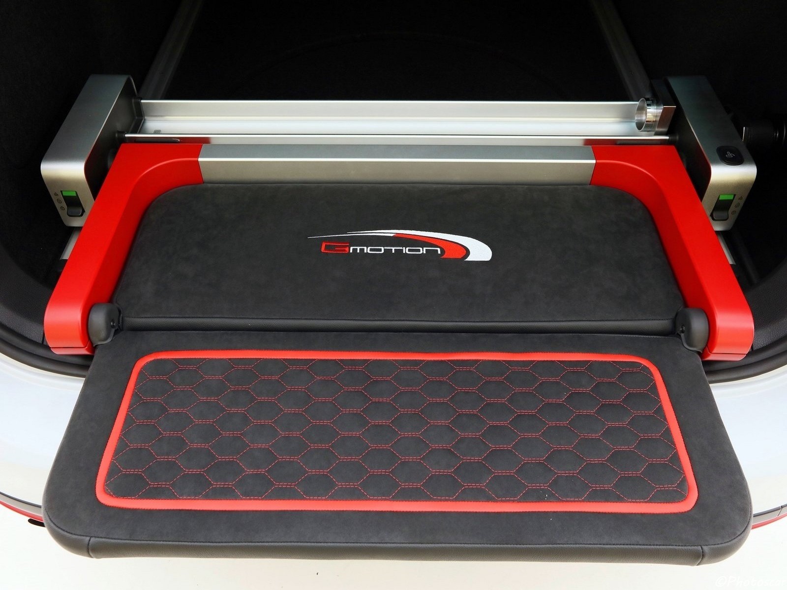 La voiture d’exposition peinte dans des couleurs opaques et brillantes. Les couleurs comme la glace, ainsi que le rouge s’harmonisent grâce à la présence d’un noir profond. Le coloris extérieur est_également présent à l’intérieur. Ainsi des sièges sport sont_revêtus de cuir avec des surpiqûres décoratives en rouge et le logo «GMOTION» brodé en forme de ruche. En outre, il comporte des décorations dans la console centrale, le tunnel de transmission et les panneaux de porte. De plus ils comportent également une peinture de finition de chrome.