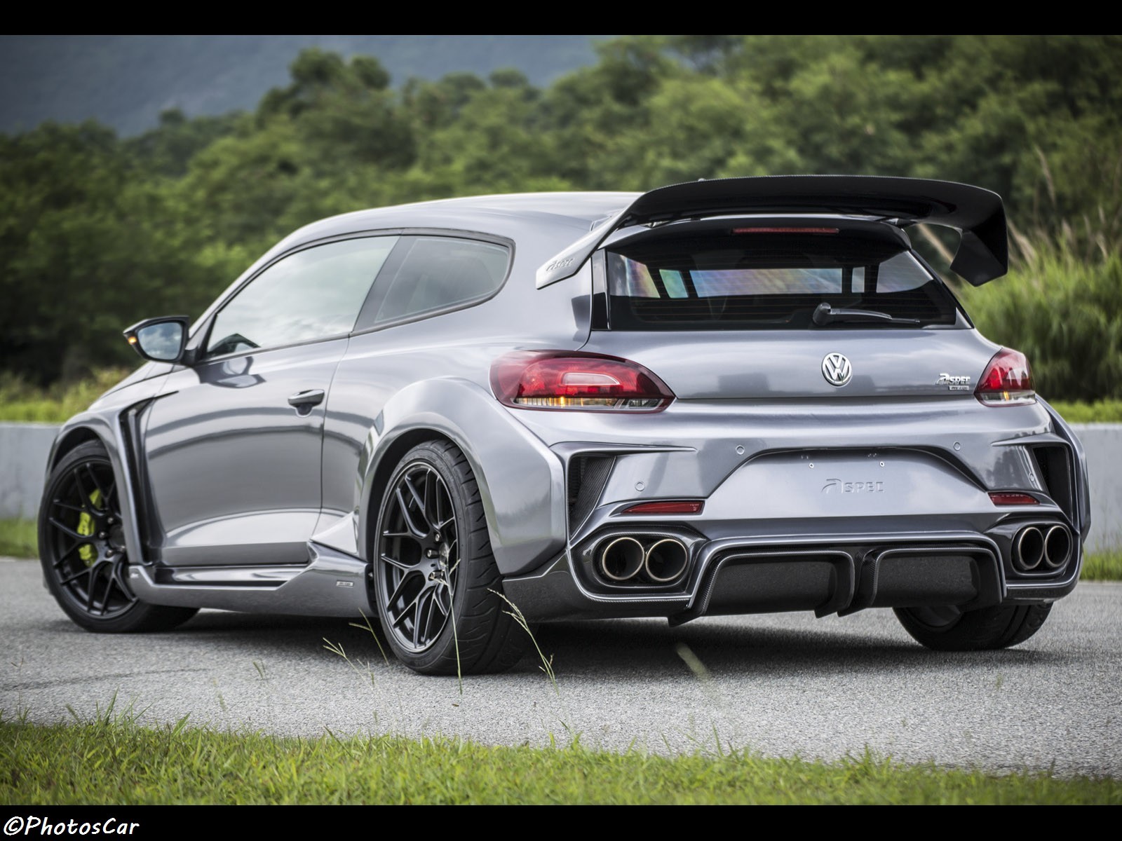 Le préparateur chinois Aspec a voulu concocter une mouture vraiment radicale de la Scirocco. Au programme dans un premier temps, un look ravageur. Les boucliers traditionnels laissent place à des pare-chocs massifs et percés d’immenses entrées d’air, avec une mention spéciale pour le bouclier arrière qui accueille une énorme quadruple sortie d’échappement entourée d’un diffuseur tout aussi massif.